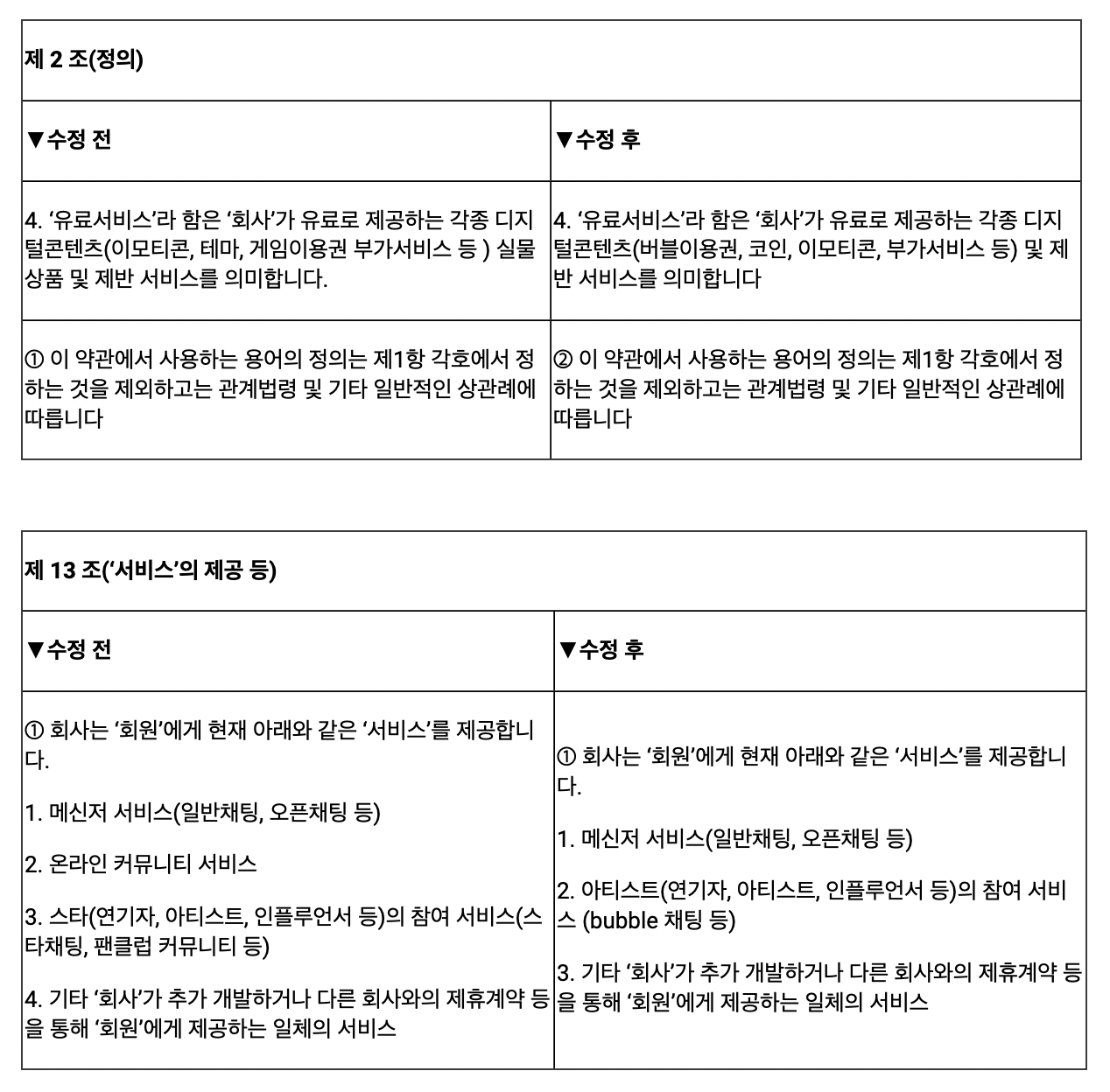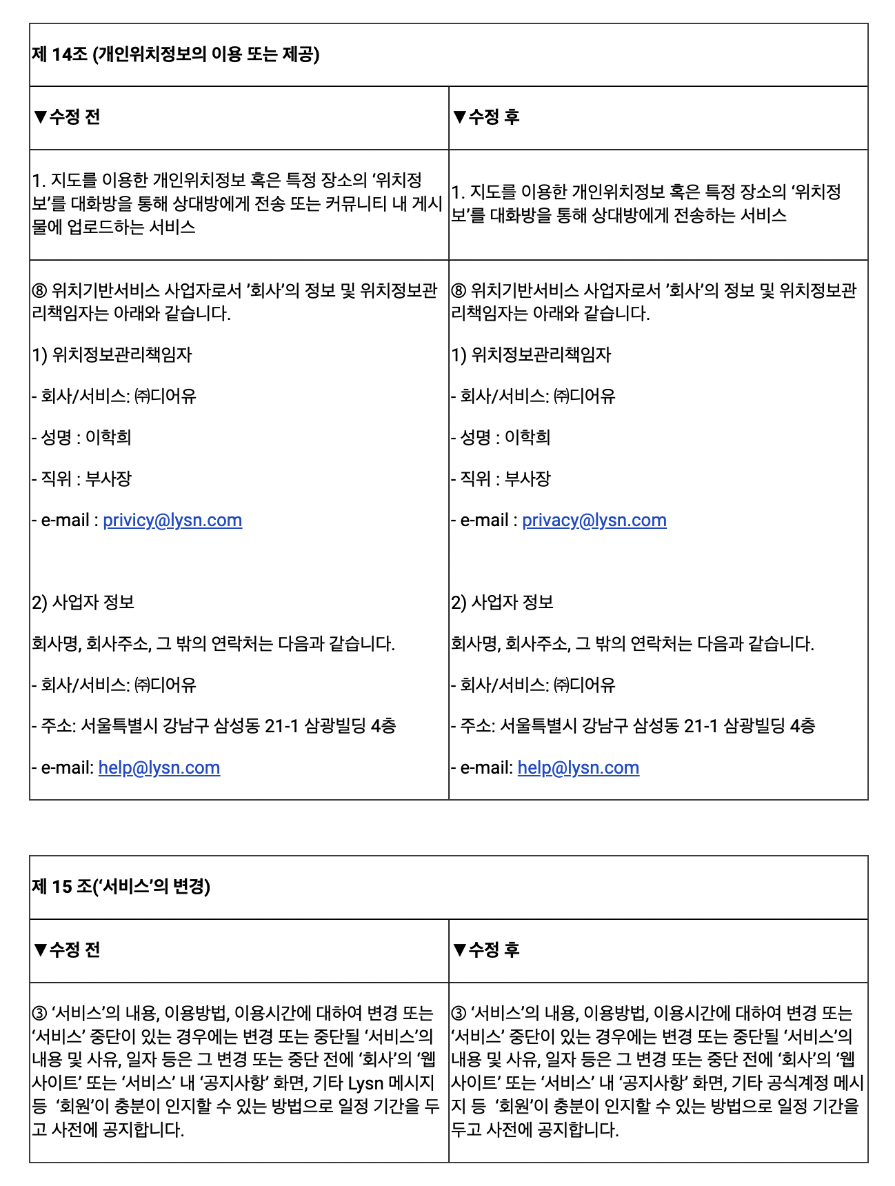 또한, 커뮤니티 서비스 종료로 인한 Lysn 서비스 이용약관 내용을 아래와 같이 개정함에 따라 주요 개정 내용과 적용 일정을 안내 드리오니, 서비스 이용에 참고하시기 바랍니다.