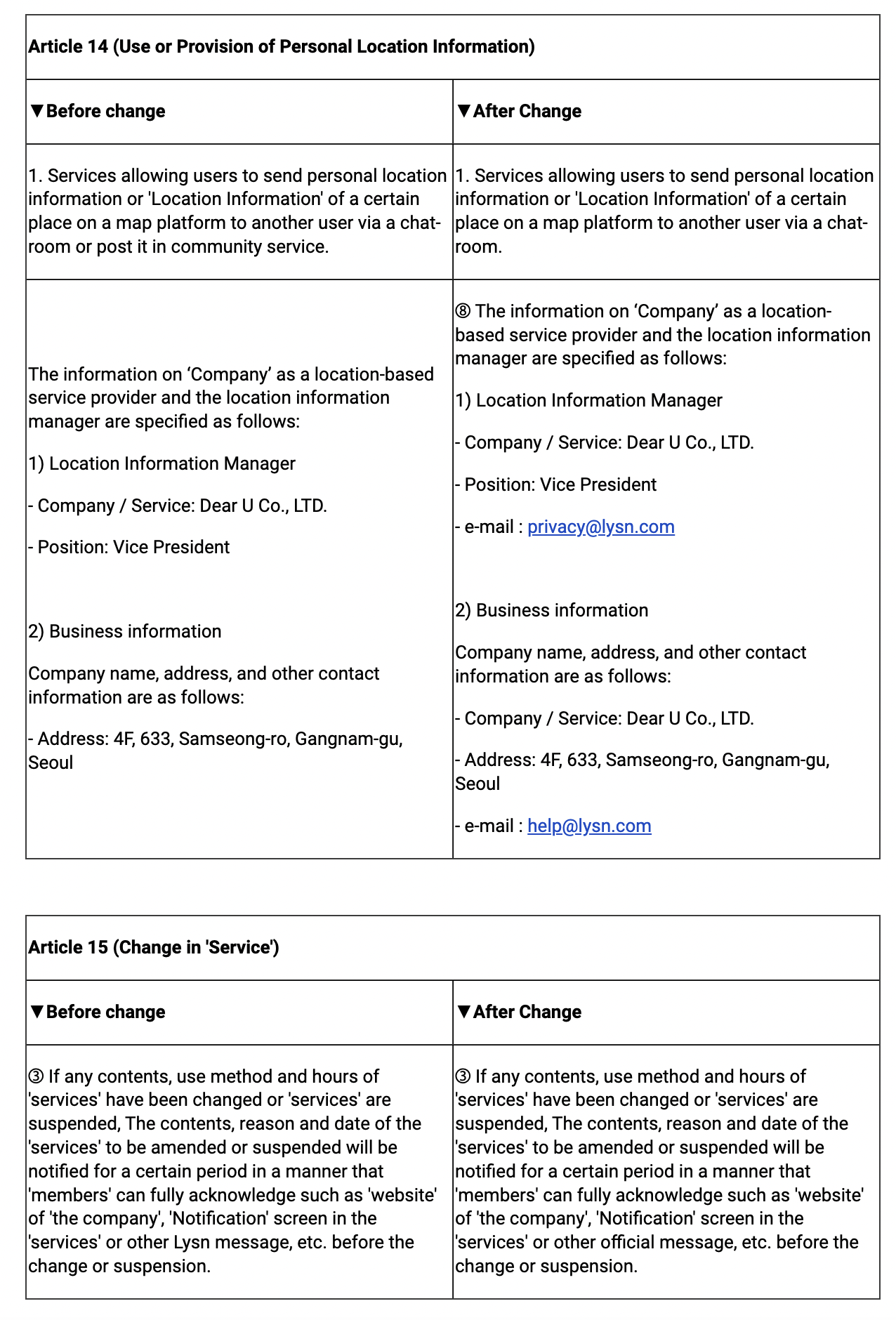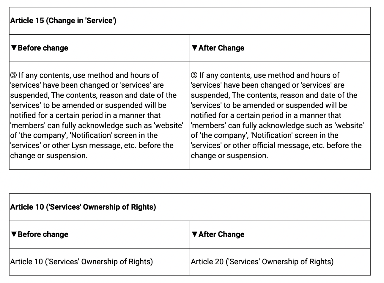 또한, 커뮤니티 서비스 종료로 인한 Lysn 서비스 이용약관 내용을 아래와 같이 개정함에 따라 주요 개정 내용과 적용 일정을 안내 드리오니, 서비스 이용에 참고하시기 바랍니다.