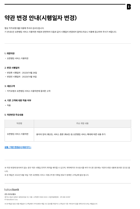 [2022.08.20]카카오뱅크 오픈뱅킹 서비스 이용약관 개정 안내(시행일 변경)리뷰&사용기 2022. 8. 21. 21:39