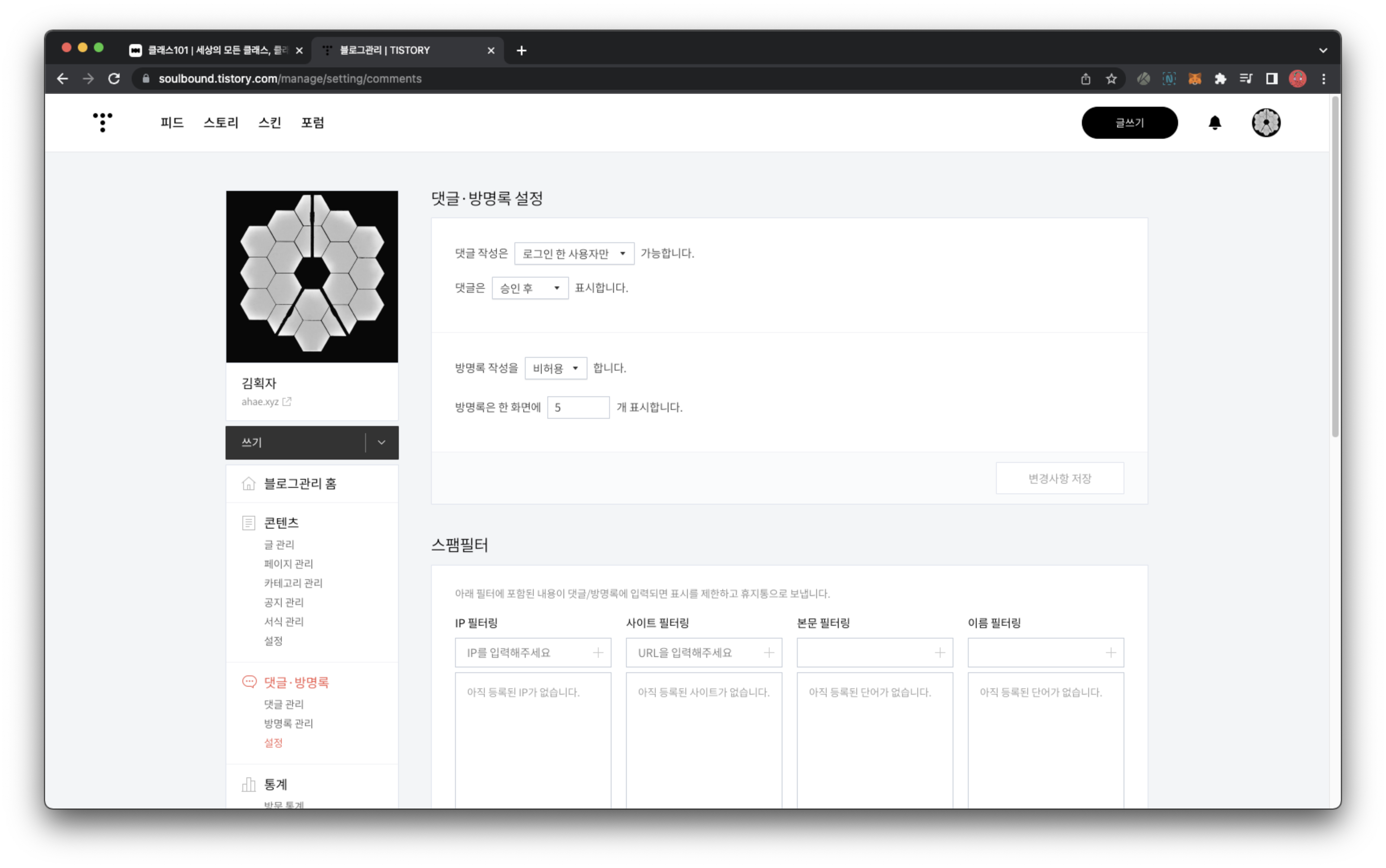 1) 블로그 관리 > 댓글/방명록 > 설정