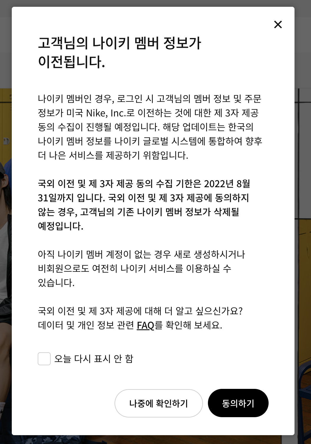 Nike Korea에서 데이터를 국외 이전한다는 팝업과 동의 시, 로그인화면으로 이동한다.