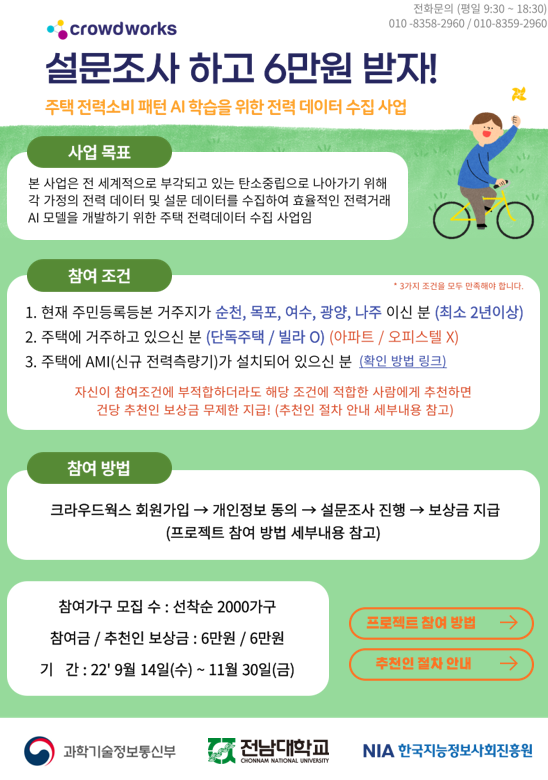 [부업 추천] 전라남도 주택 전력소비패턴 AI 학습 데이터를 위한 전력 데이터 수집 설문 참여 6만원 / 추천인 6만원