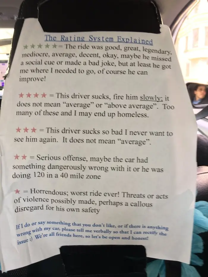 - Beginning at ⭐️⭐️⭐️⭐️⭐️— "got me where I needed to go" — the explanations quickly descend into parodic paranoia. ⭐️⭐️⭐️⭐️: "This driver sucks, fire him slowly ... Too many of these and I may end up homeless." ⭐️⭐️⭐️: "This driver sucks so bad I never want to see him again." ⭐️⭐️: "maybe the car had something dangerously wrong with it or he was doing 120 in a 40 mile zone.”