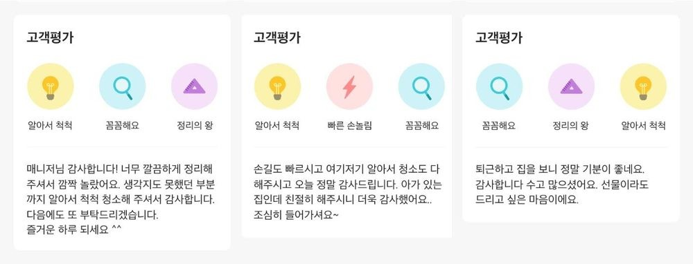 저희는 서비스에 별점을 매기지 않아요. 근원적인 고민이 많았어요. 그런데 저희 서비스는 사람이 하잖아요. 직장에서 상사가 일할 때마다 '5점 만점에 몇 점' 점수를 매긴다고 생각해봐요. 다니기 싫을 것 같더라고요. 점수가 아무리 높아도 사람이 하는 일이라서 물리적 제약도 있고요. 사람은 상품이 아니라서 별점 높은 사람이 모든 곳에 가서 일할 수 없어요. 우리는 다른 방법을 찾았어요. 점수 대신 칭찬 배지를 드려요. 칭찬을 받으면 좋고, 못 받으면 부족한 점을 고민해 더 나아지도록 노력하죠. 컴플레인이 들어오면, 부족한 점을 전달하고 재교육을 해요. 전반적인 서비스의 질을 끌어올리는데 주력하고 있어요. 이렇게 기본 역량을 키우는 게 오래가는 방법이라고 생각해요. 이곳에 내용을 입력해 주세요